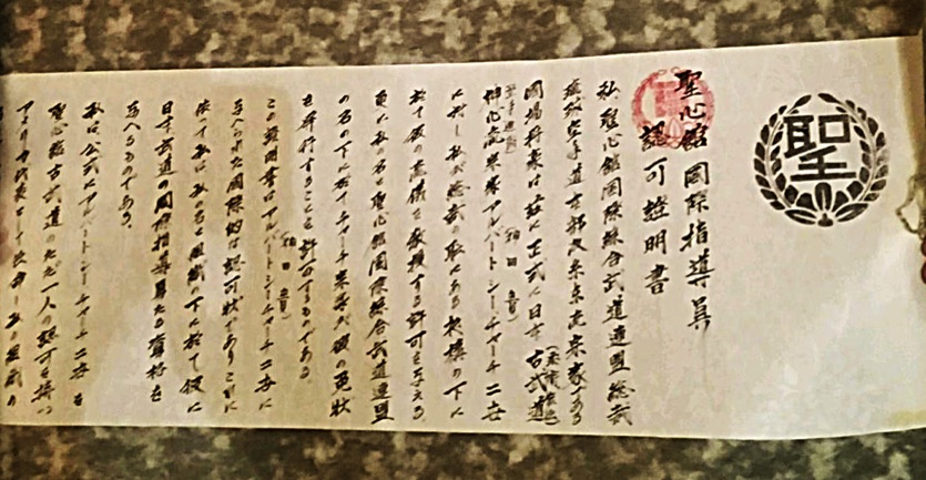 This license bestows unto Albert C. Church [Kanda Takashi], Jr., this international authorization and accordingly, below I [affix?] my name and to him ....[??] bestow as Japanese Martial Arts International Instructor. I officially [appoint] Albert C. Church, Jr. as the only person who holds a Seishinkan Ancient Martial Ways License/approal/permission.