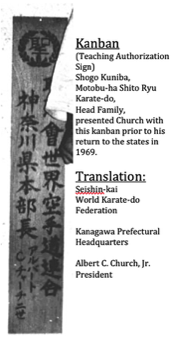 Prior to Church's return to the United States, in 1969, Kuniba presented him with a kanban, (formal teaching authorization sign).